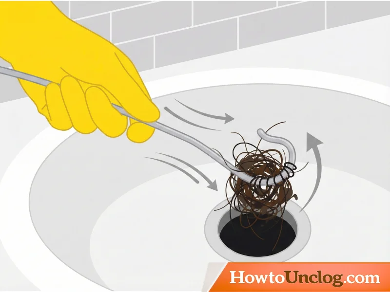Gently insert the hooked end of the wire into the drain opening. Slowly rotate and maneuver it to catch the debris and hair visible at the drain entrance. Once you feel it’s caught, gently pull upward. Don’t jerk or yank—slow and steady extraction prevents the debris from breaking apart and pushing back down.